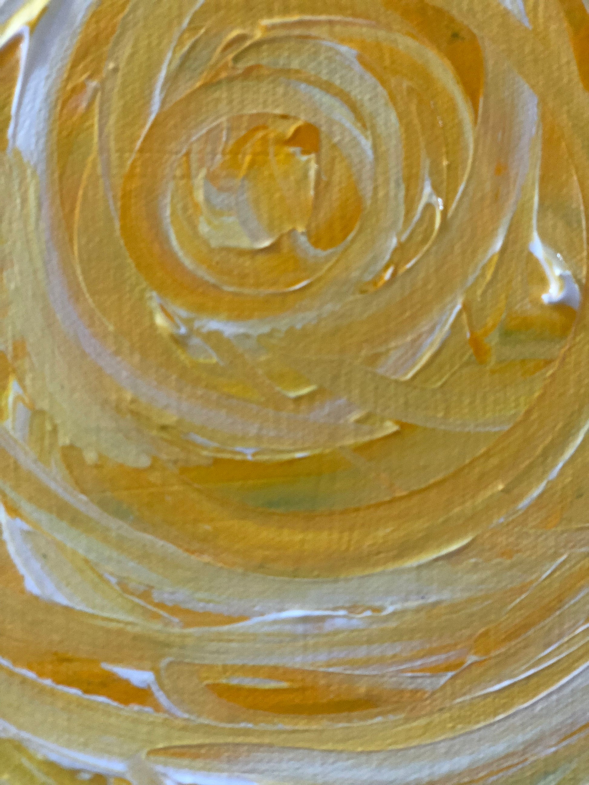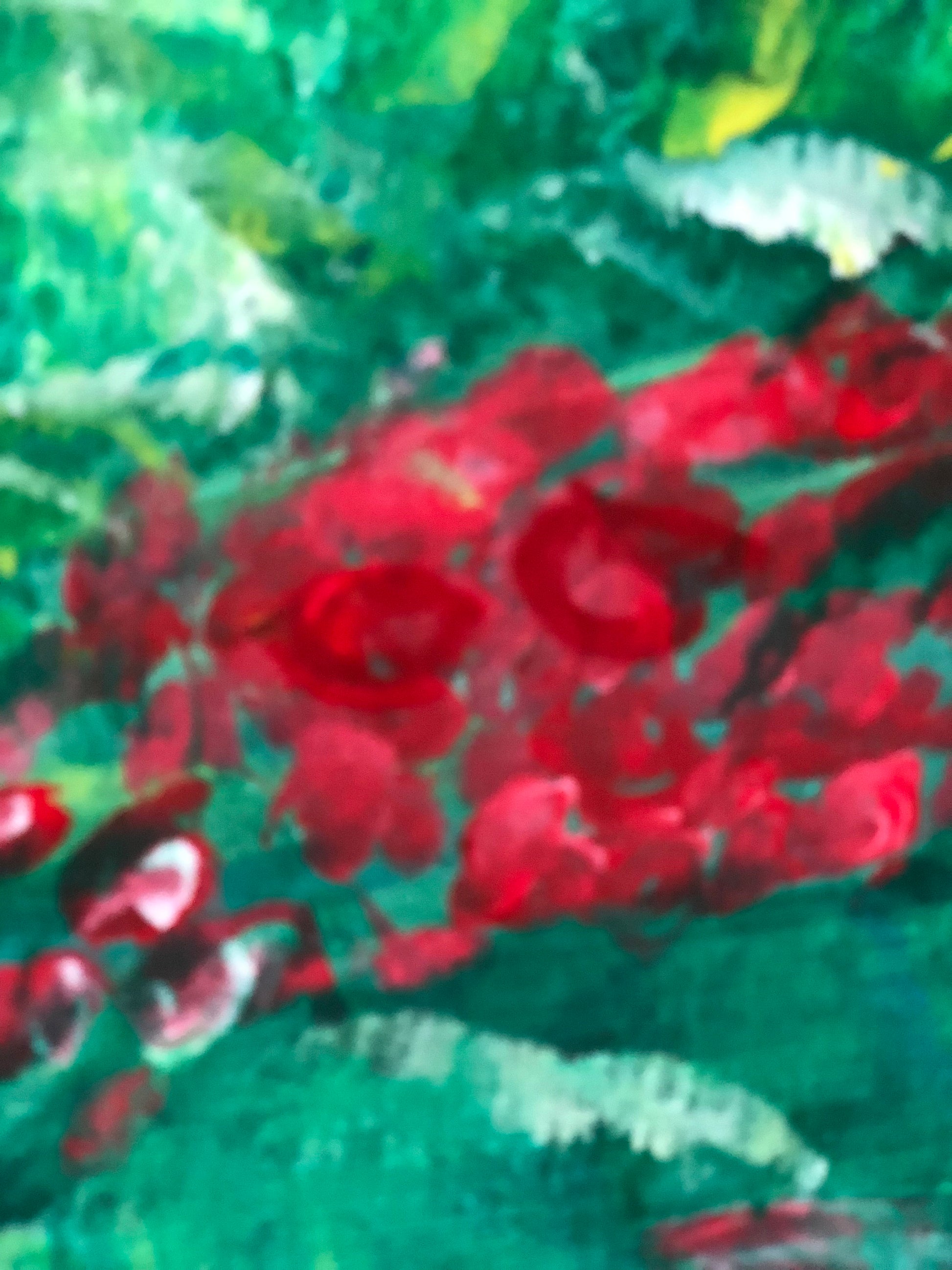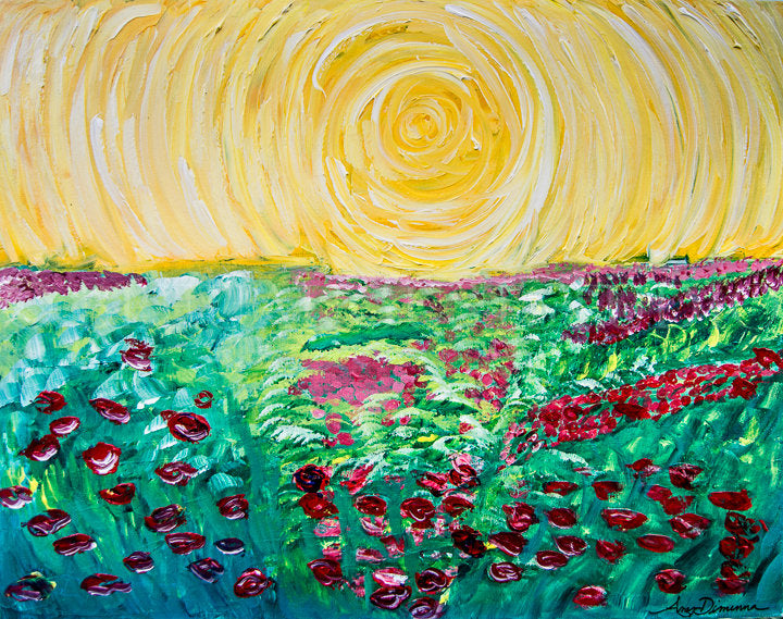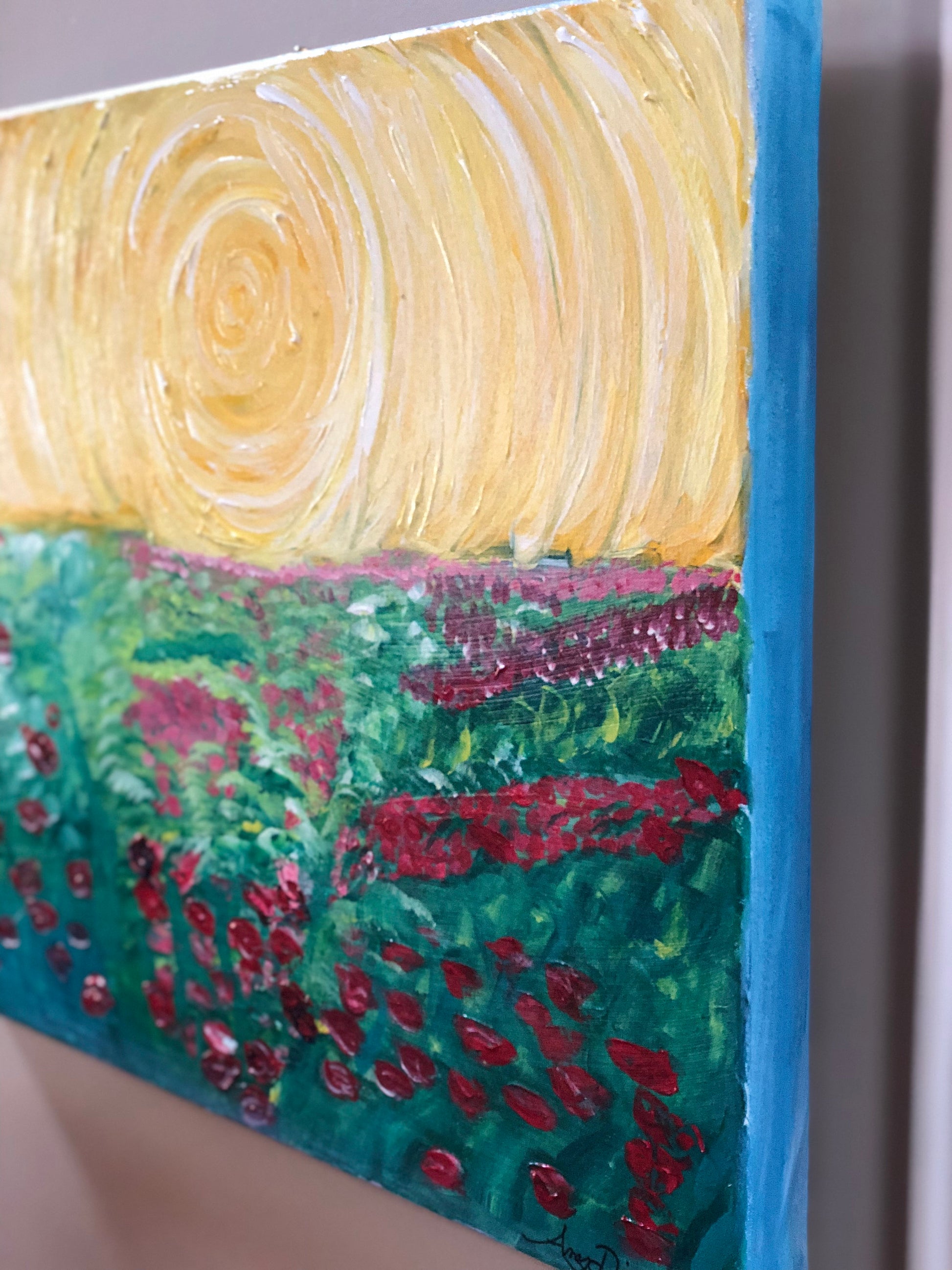 The painting was started by using a palette knife to develop the field, the sun and the poppies. Later a various paint brushes were used to create the layers.